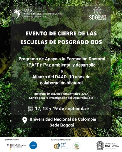 La sede Bogotá de la Universidad Nacional de Colombia (UNAL) recibió entre los días 17, 18 y 19 de septiembre de 2025 el evento de cierre del Programa de Apoyo a la Formación Doctoral (PAFD) y de la Alianza de Escuelas de Posgrado del DAAD sobre los Objetivos de Desarrollo Sostenible (ODS) (SDG-GS). Además, se sumó a la celebración de los 100 años del DAAD.